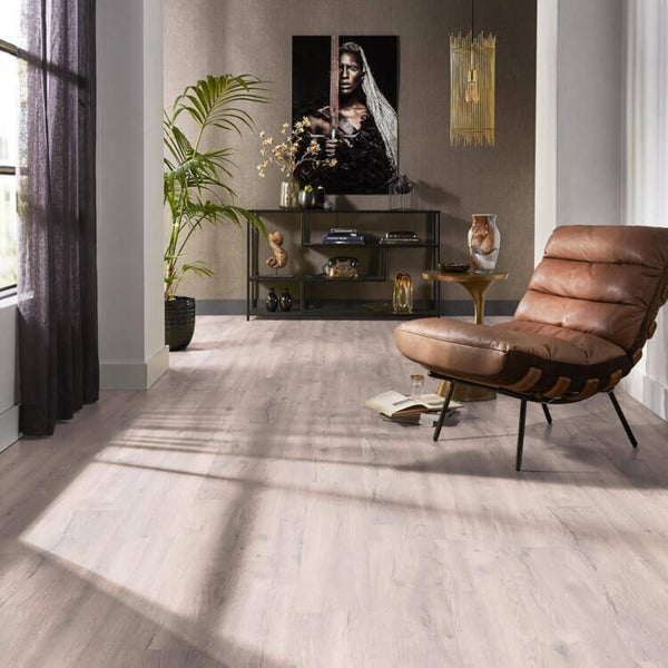 De Ambiant Ingelstad Eiken Beige is een stoere lichte laminaat vloer. Door de rustiek uitstraling, de realistiche voelbare structuur en doordat de Ambiant Ingelstad Eiken Beige een extra brede plank is, is deze laminaatvloer bijna niet te onderscheiden van een echte eiken houten vloer. Dit laminaat is gemakkelijk te leggen door zijn unieke 5G klikverbinding en mag ook, in combinatie met de juiste ondervloer, gelegd worden op vloerverwarming. De Ambiant Ingelstad Eiken Beige is een frisse lichte kleur die vaak wordt gekozen voor op de slaapkamers., maar ook zeker geschikt is voor in de woonkamer.