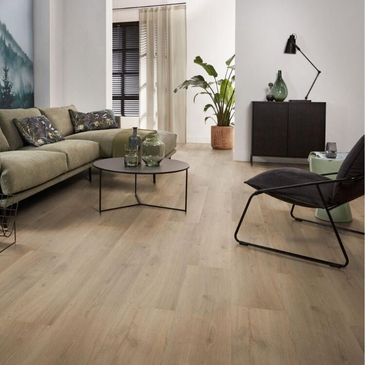 Ontdek de Ambiant Aachen laminaatvloer in de warme Bruin Eiken tint, perfect voor wie een sterke, slijtvaste vloer met een authentieke houtlook zoekt. Dit hoogwaardige laminaat brengt de natuurlijke charme van hout naar je woonkamer, slaapkamer, hal of kantoor, zonder het onderhoud.